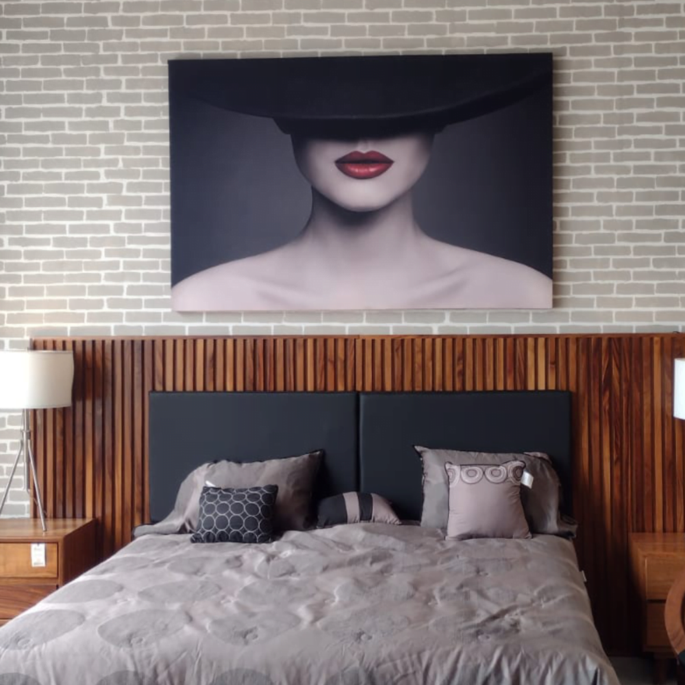 Visualiza un cuadro decorativo que captura la esencia del misterio y la elegancia. En el fondo, se encuentra la figura de una mujer cuya mitad del rostro está delicadamente oculto bajo un sombrero negro, añadiendo un aire de intriga. La sombra del sombrero resalta la forma de su rostro, dejando entrever una mirada profunda y cautivadora. Lo más llamativo de la obra son sus labios, que destacan en un vibrante color rojo, creando un contraste impactante con la paleta oscura y sutil del resto del cuadro. Esta combinación de elementos evoca una sensación de sofisticación y seducción, haciendo que el espectador se sienta atraído por la historia que la mujer podría contar.