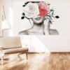 El cuadro muestra una imagen de un rostro humano dividido en dos mitades contrastantes. La mitad izquierda está pintada en un tono blanco brillante, mientras que la mitad derecha está en un tono negro profundo. El rostro tiene los ojos cerrados, lo que le otorga un aire de serenidad o contemplación. El uso del blanco y negro crea un fuerte contraste visual, sugiriendo un tema dualista o de equilibrio entre opuestos, como luz y oscuridad, bien y mal, o el yin y el yang. El estilo parece ser minimalista y simbólico, enfocándose en el juego de luces y sombras para crear una sensación de armonía.