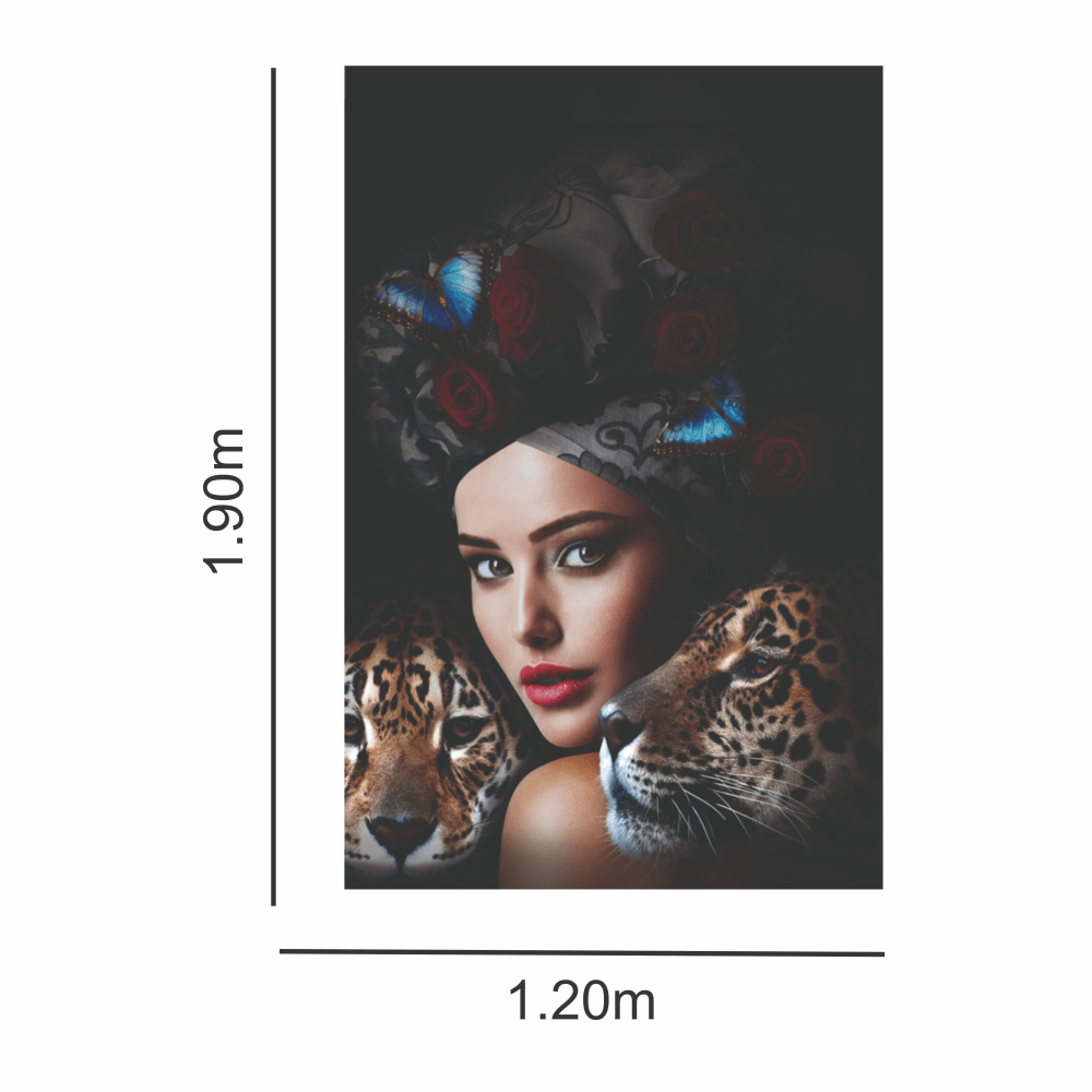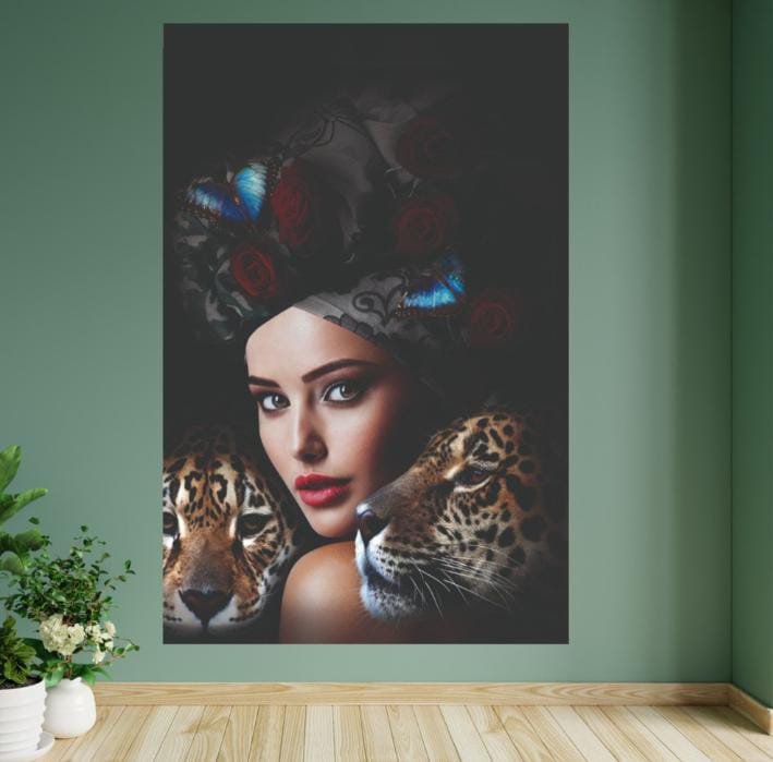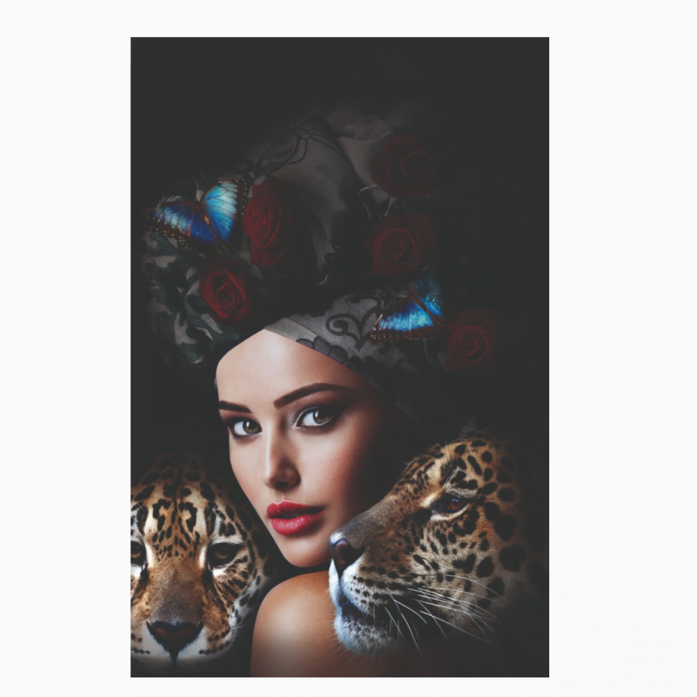 El cuadro muestra una imagen llamativa y enigmática de una mujer con rasgos delicados y un rostro expresivo. Su piel es clara y sus ojos verdes se destacan, miran directamente al espectador, transmitiendo una sensación de fuerza y calma. A su lado, en una composición simétrica, hay dos leopardos con pelaje moteado, cuyas cabezas flanquean el rostro de la mujer. Los leopardos parecen tranquilos, casi protectores, como si formaran parte de un vínculo íntimo con la figura central.