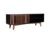 Este porta TV tiene un diseño moderno y minimalista. Está fabricado con una combinación de madera y detalles en blanco liso, lo que le da un estilo contemporáneo. Tiene tres compartimentos de almacenamiento, dos cerrados con puertas en color blanco y uno abierto en el centro, ideal para colocar consolas, reproductores de DVD o decoraciones. Sus patas en forma cónica y en madera natural le brindan estabilidad y un toque retro. Perfecto para cualquier sala de estar o área de entretenimiento.