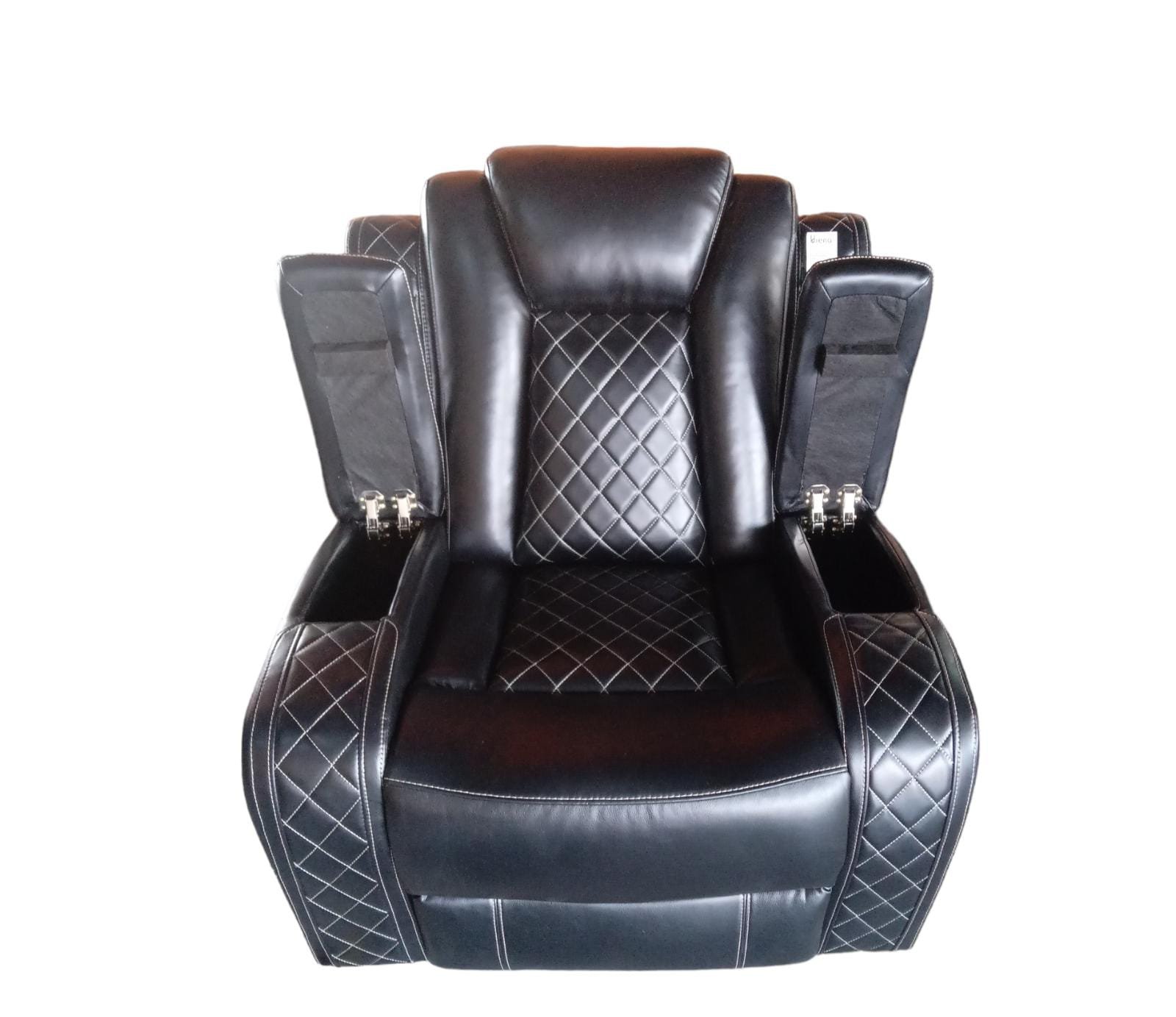 HERMOSO Y COMODO SILLON LEATHER TAPIZADO EN COLOR NEGRO CON ILUMINACION LED TONO AZUL CUENTA CON 2 CONSOLAS DE ALMACENAMIENTO MUY PRACTICAS LAS CUALES RESULTAN MUY FUNCIONALES